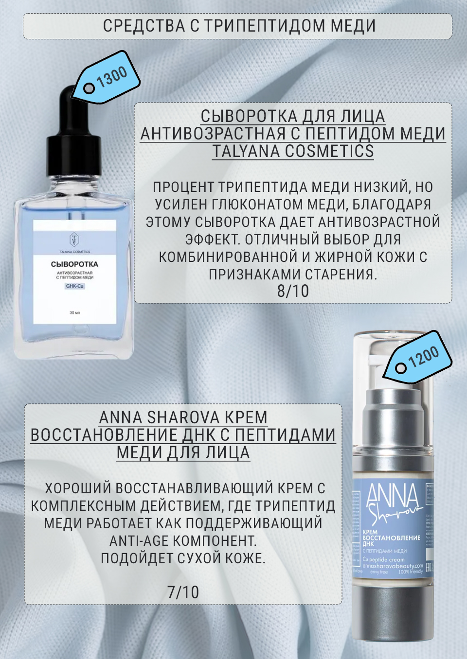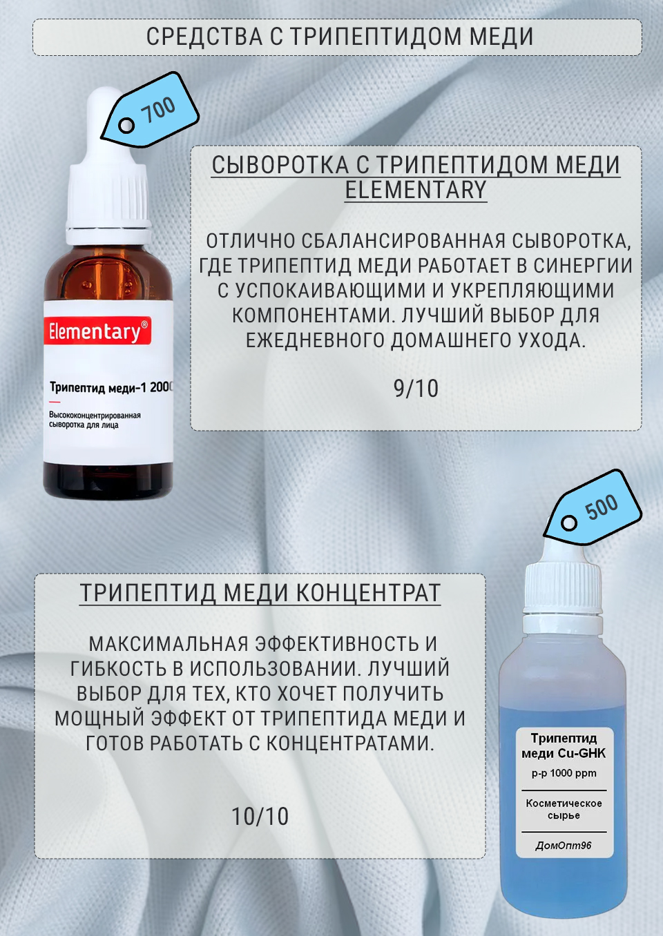 Если вам нужен максимальный и быстрый эффект для коррекции серьезных возрастных изменений или повреждений — выбираем чистый актив Трипептида меди (CU-GHK) для добавления в ваш крем. Для ежедневного комплексного ухода за чувствительной и обезвоженной кожей лучшей является сыворотка Elementari.