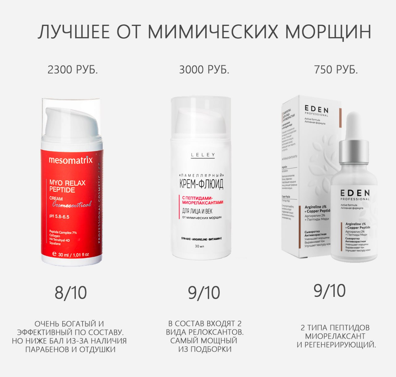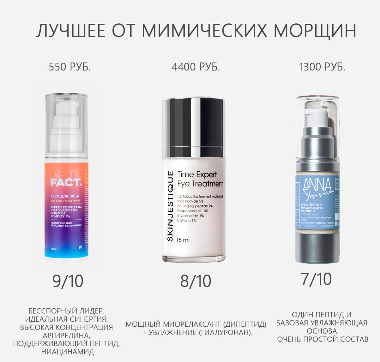 Самый популярный пептид от мимических морщин – аргирелин. Он временно расслабляет мышцы лица, из-за чего морщины разглаживаются и медленнее появляются новые.