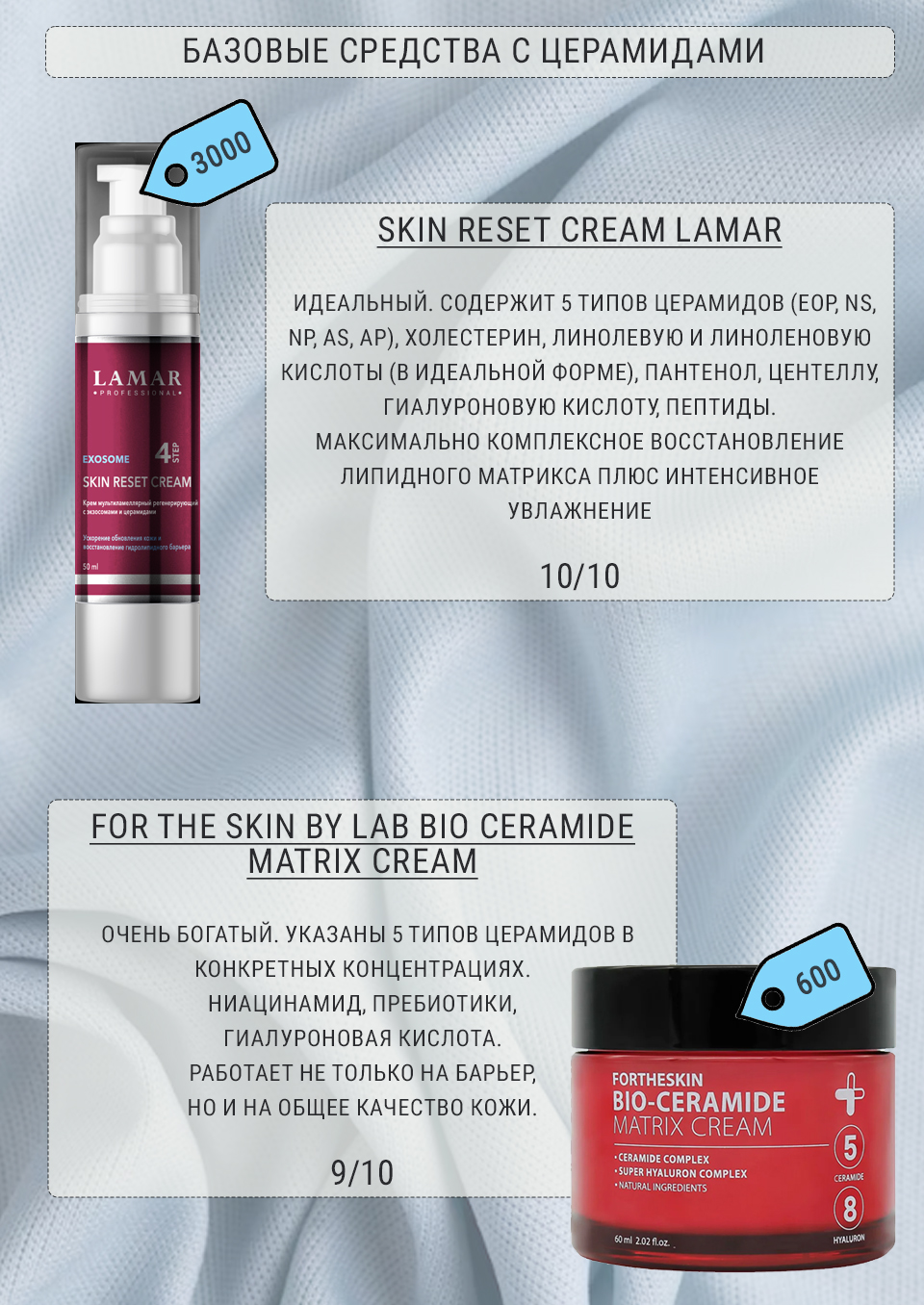 - Церамиды (Ceramides) — самый важный компонент, который должен быть в креме. Ищем комплекс церамидов (например: ceramide AP, ceramide NS, ceramide EOP и тд), а не один. Церамиды бывают разной длины, и каждый выполняет свою задачу. В коже они работают только вместе, как пазлы разного размера. Поэтому крем с одним церамидом, не восстановит барьер.
